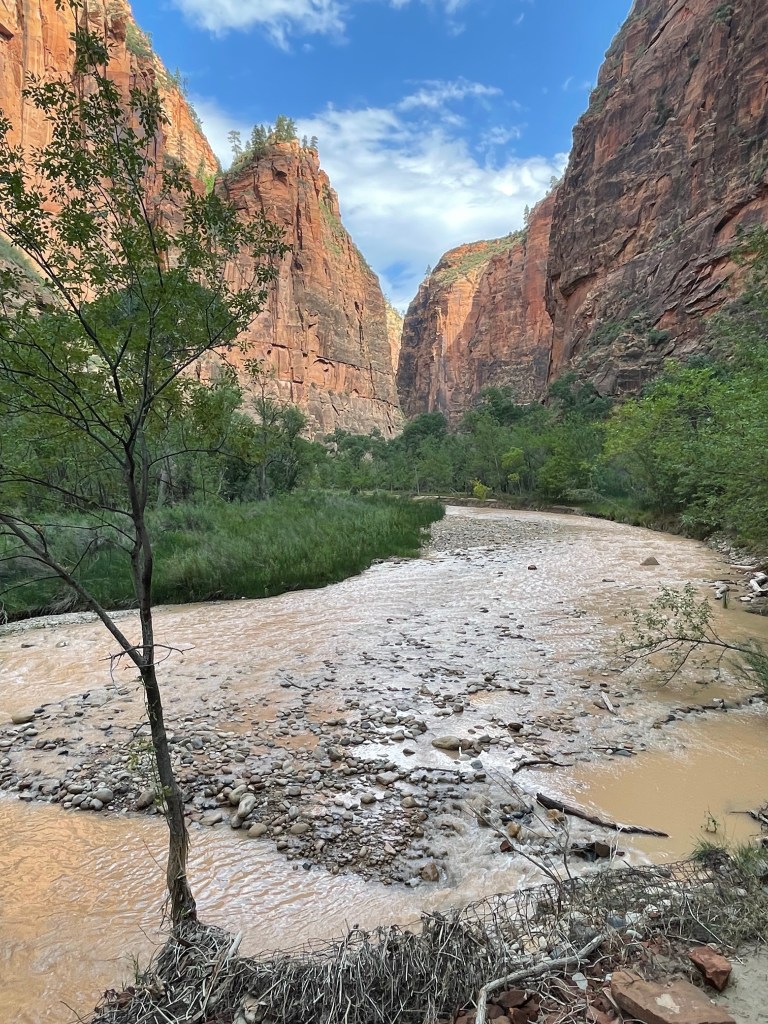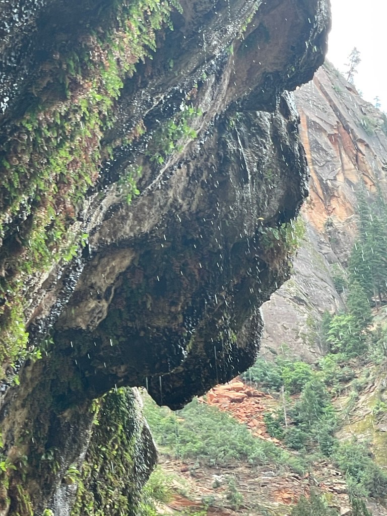 Zion National Park has been here for a very long time. Ever since there have been people, they have lived, hunted and prayed here. It seems to me that in this part of the world, everything starts with water. Water has to be one of the most powerful forces ever conceived. Look what it has done to all these different layers of rock. Given enough time I’m sure the Virgin River could find its way to the center of the earth! It is out there doing its thing not even 100 feet from where I sit right now!