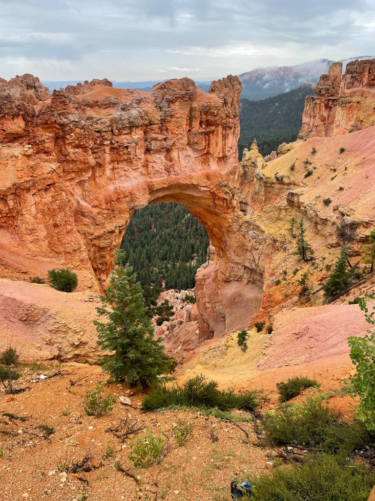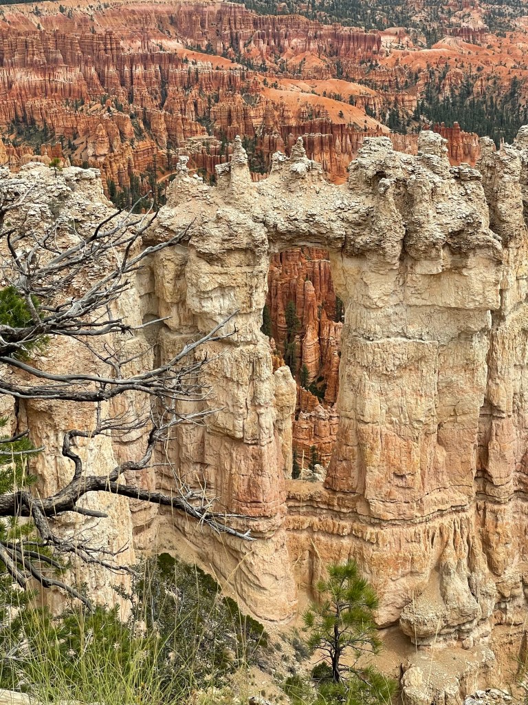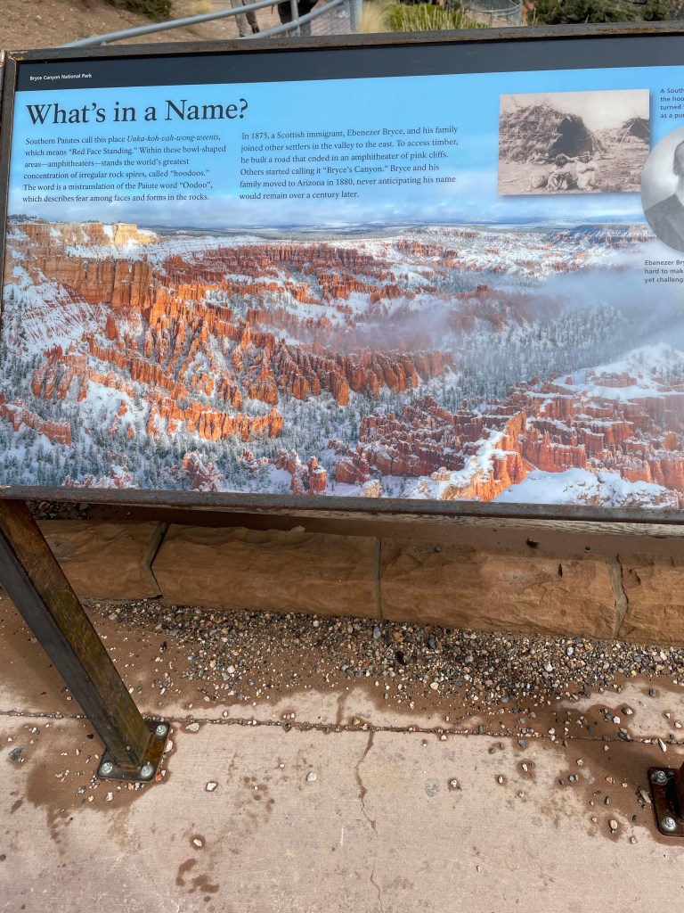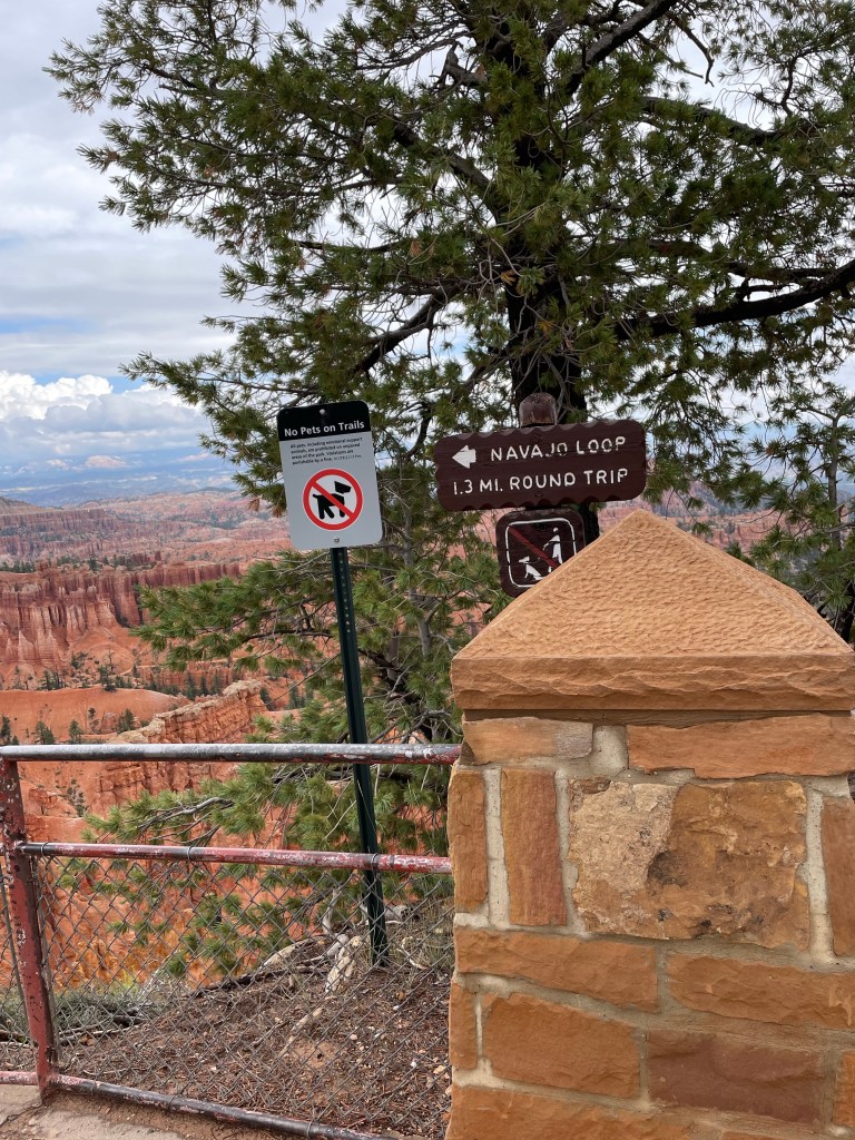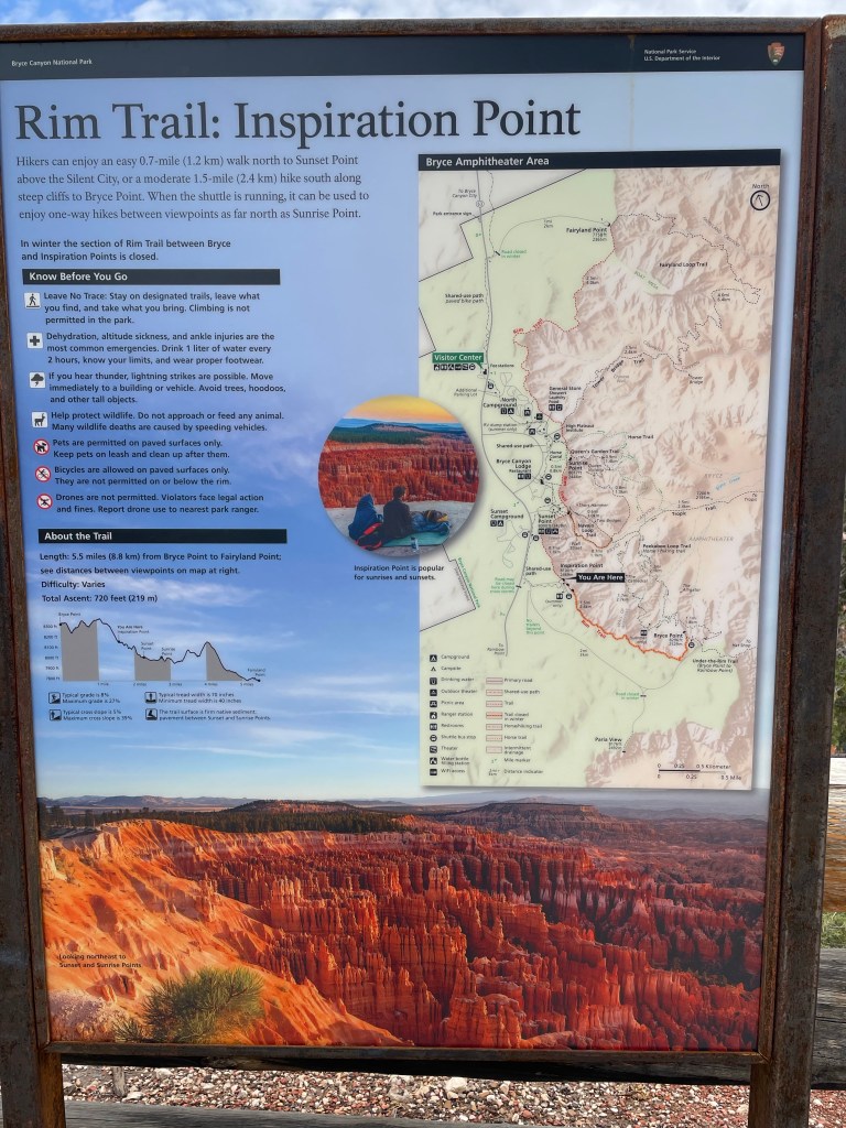 My first stop is to go straight to the Visitors Center to get my stamp in my National Parks Passport. I usually then go over to the information desk and discuss what I would like to accomplish while I am in the park. The conversation goes like this….. I tell them how long I have to be in the park. I also tell them how mobile I am feeling that day. They are such a good source of information and knowledge. They always start to highlight on a map of the park what I should see and how to accomplish this. Every park is different. They all make up their own rules that make sense for that park. Sometimes I’ll drive all over the place. Sometimes I am riding on shuttle busses or trolleys taking me from point A to Point B. Today was a hybrid kind of day. I drove to one end of the area known as the Bryce Amphitheater. I started at one end of a trail called the “Rim Trail”. It has four distinct Viewpoints and the trail runs from point to point. Some sections of the trail are considered very easy, Some sections are considered easy/moderately difficult. My knee wasn’t barking at me this morning so i decided to do the whole trail. Here are some of the pictures I took along the way. I don’t know exactly how long the trail is. I do know that at the end of the trail I had 11,00 steps on my watch.