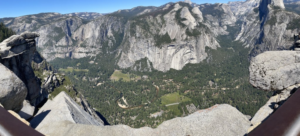 We crossed the bridge and headed back to the campground. Once there we put the bikes away and loaded into the car. We were headed to a place that we can see from our campsite. Glacier Point. Glacier point is way above the campsite in elevation. It sits at 7200 feet in elevation. The campsite is at around 4000 feet in elevation. So we only had to climb just a little over 3000 feet! Much easier done in a car. We drove for over an hour in order get to Glacier Point. The views from Glacier Point were astonishing! As good as the views have been for the last two days, todays view from Glacier Point put all the rest to shame in my humble opinion. Unfortunately I don’t think my photography skills do justice to what we experienced.