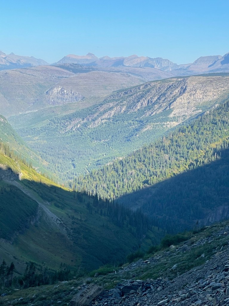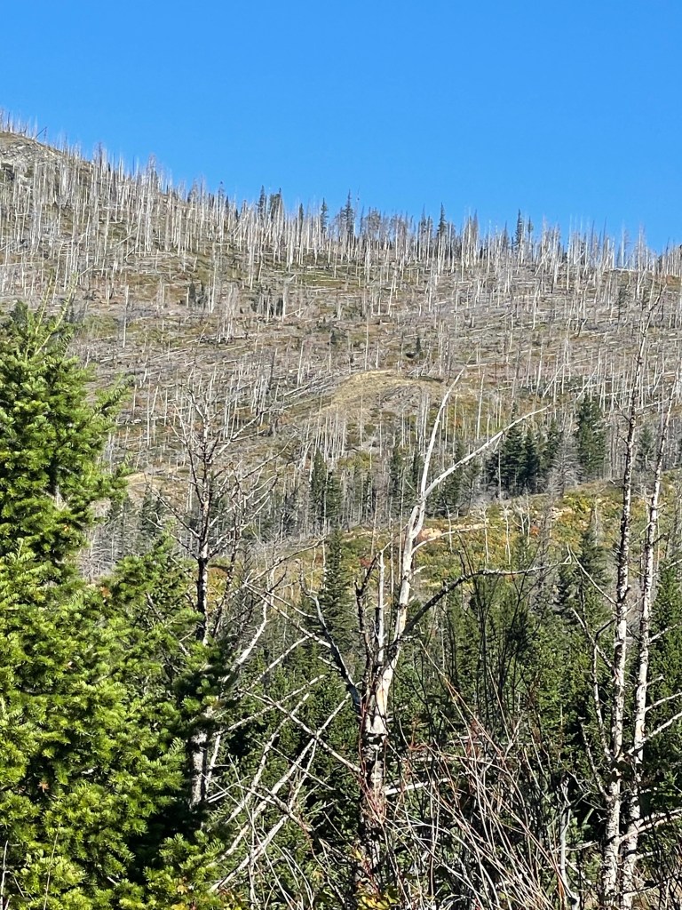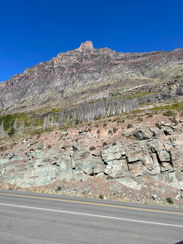 In 2015 The forest on the East side of Logans Pass caught fire. They believe it was started from an unauthorized backpacking campfire. The fire ended up consuming over 5000 acres of forest land. Eight Years later, there are small seedlings starting to grow. It sure takes a long time to regrow a forest!